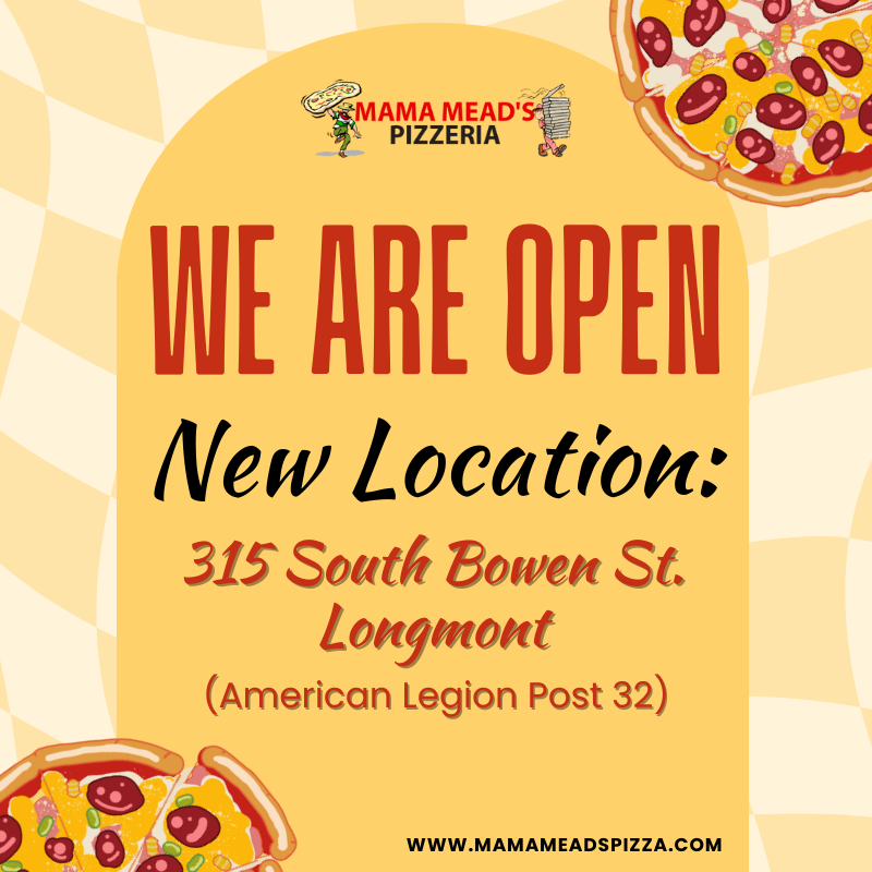 Mama Mead’s Pizzeria is excited to reopen at our new location at 315 S. Bowen St (American Legion Post 32) in Longmont. We sure have missed you all and hope you will come by and see us for the same great pizza and sides you love!